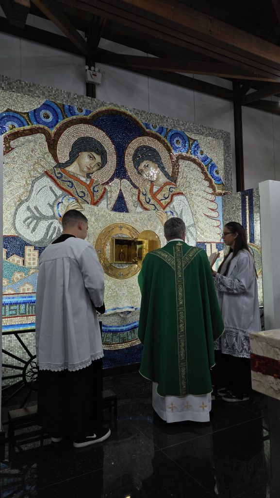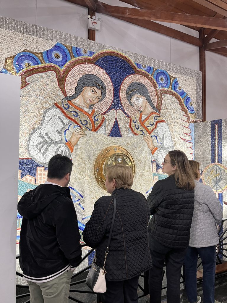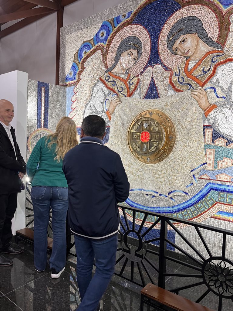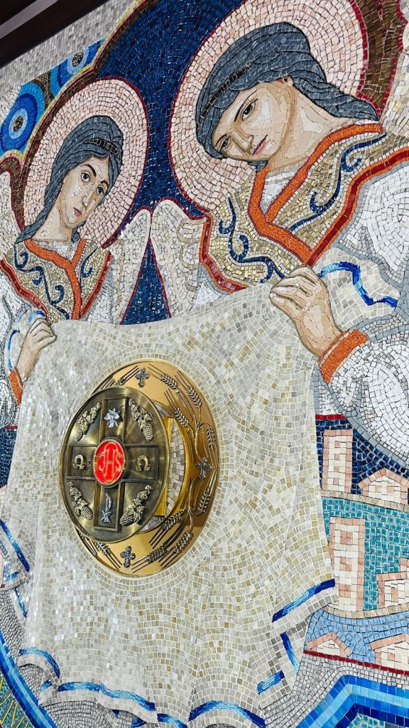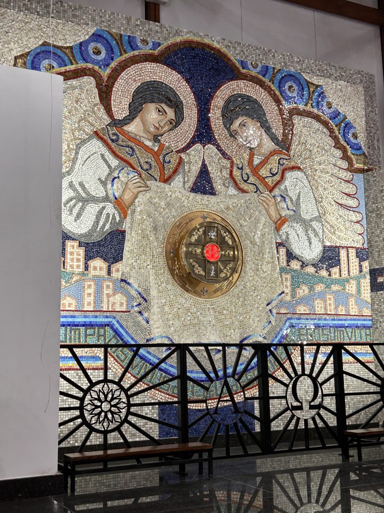 No centro do mosaico está o Tabernáculo, onde Jesus Eucarístico permanece exposto. Essa posição central nos recorda que Ele é o centro de tudo: da nossa vida, da Igreja e da nossa missão. Nada é mais importante do que a Sua presença viva entre nós.