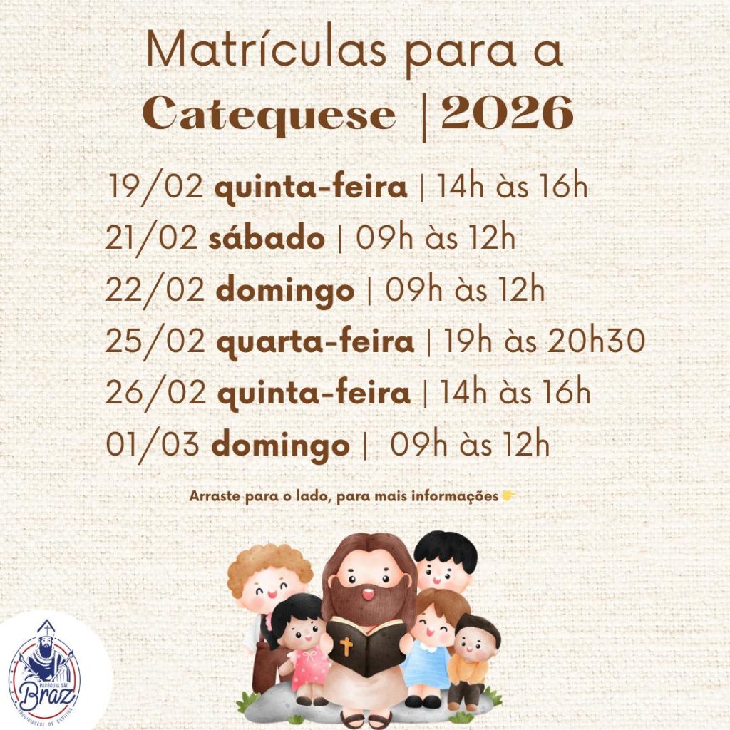A Paróquia São Braz informa que estão abertas as matrículas para a Catequese 2026. Convidamos pais e responsáveis a garantirem a inscrição de seus filhos para mais um ano de formação na fé, crescimento espiritual e vivência em comunidade.